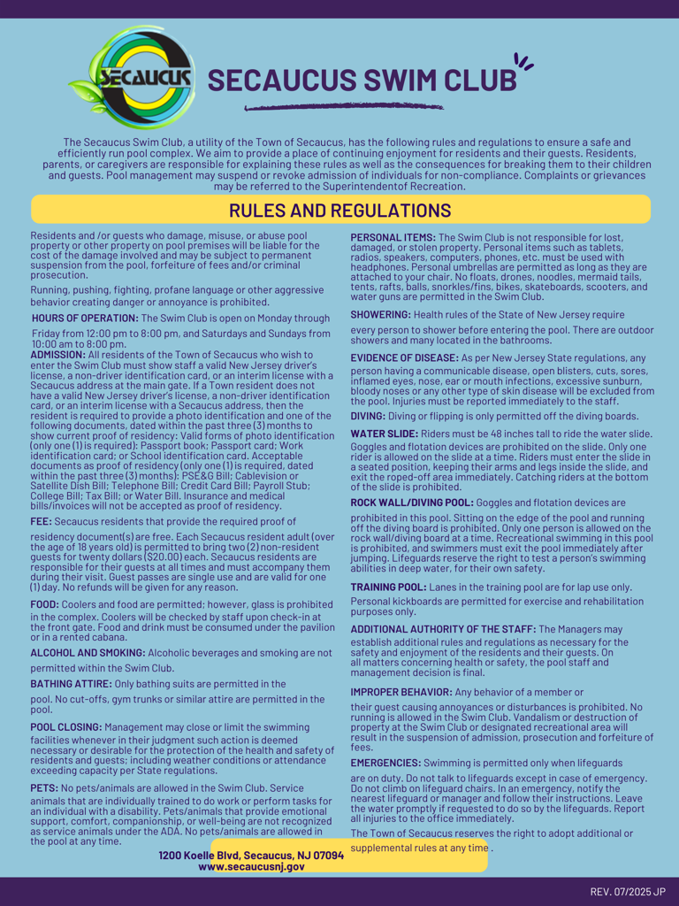 - Alcoholic beverages are not permitted within the Secaucus Swim Club. This includes the Secaucus Recreation Center parking lot.